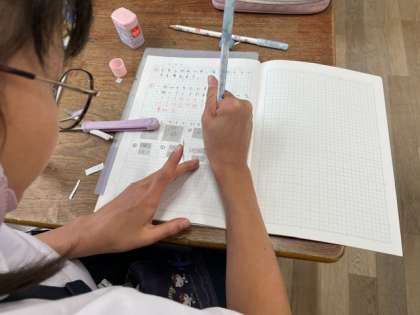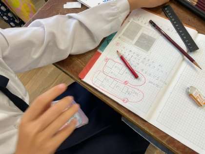 算数の学習では、じんとりゲームの結果を調べる学習をしました。広さを比べるにはいろいろな方法があることに気がつきましたね。さて、どちらが勝ったのでしょうか。