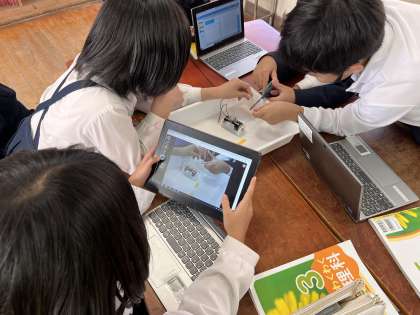 理科の学習では、「どんなものが電気を通すのか」グループで考えた物で実験をしました。タブレットの使い方にも慣れ、意見交流もスムーズにできるようになりましたね!