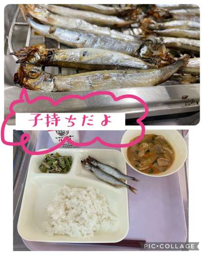 今日は骨ごと食べられるししゃもが出ました。子持ちでふっくらしていました。焼き色がきれいにつくように、料理酒、みりん、油で下味をつけて、焼いています。給食に使われているししゃもは、カラフトシシャモ(カペリン)と呼ばれる魚です。