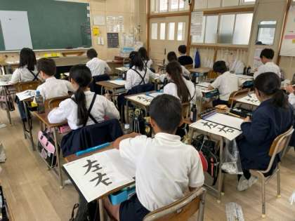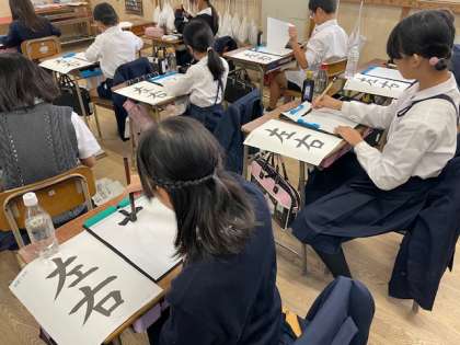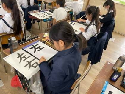 習字では、「左右」という字を書きました。普段何気なく書いている漢字ですが、バランスが難しかったようです。