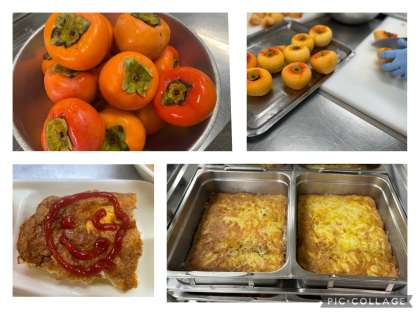 27日の今日は、秋冬が旬の『ごぼう・だいこん』の味噌汁が出ています。いわしのつみれは、臭みをとるために下茹でした後、生姜汁と料理酒で下味をつけています。