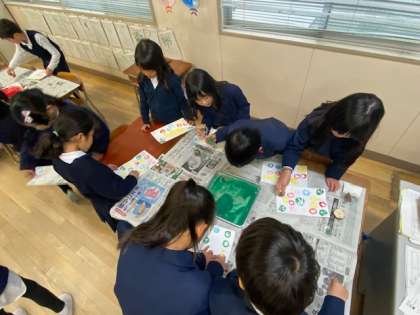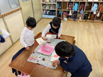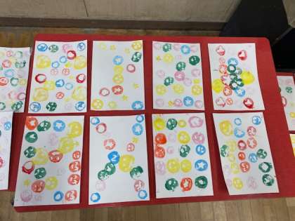 育てたサツマイモを使ってハンコ作りをしました!好きな絵や文字などを掘って、いろいろなハンコができました。そして、今日は画用紙に押して楽しみました!!