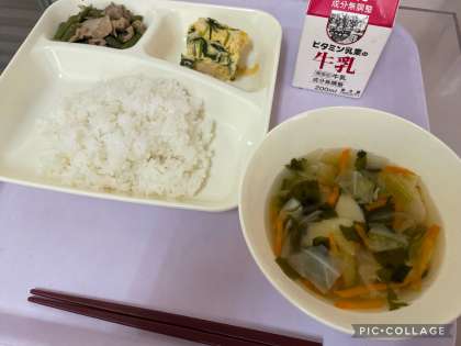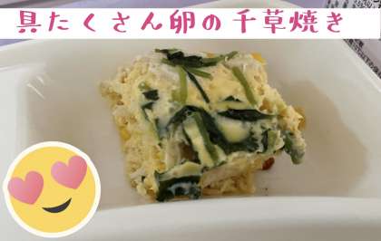 千草焼きとは、卵に細かくきざんだ具材を混ぜ合わせて焼いた料理です。今日の給食の千草焼きは卵の中に、鶏肉、とうふ、コーン、みつばが入っています。