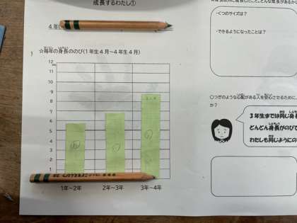 「成長するわたし」について学習しています。1年生から4年生までの身長では、どれだけの伸びがあったのか、グラフにして話し合いを行いました。できることもたくさん増えたんだね。