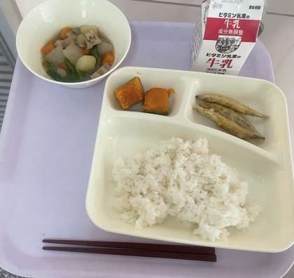 今日は冬至にちなんだ給食で、かぼちゃを使っています。冬至には、「ん」が2つつく食べものを食べると運がつき良いと言われています。ちなみに、かぼちゃは別名、南瓜(なんきん)といいます。また、冬至の七草として、他にも「寒天、銀杏、人参、蓮根、金柑、うどん」があります。うどんは、昔「うんどん」と言われていました。今年の冬至は、12月22日(金)です。冬至かぼちゃに、ゆず風呂に入って元気に冬を乗り越えましょう!(^^)/