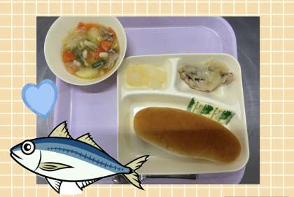 あじの脂質には、脳の働きを活性化させるDHAや、血管をしなやかにし、血液の流れを良くするといわれているEPAが含まれています。今日の給食では、揚げた鯵に、レモン果汁でマリネしたたまねぎをかけています。