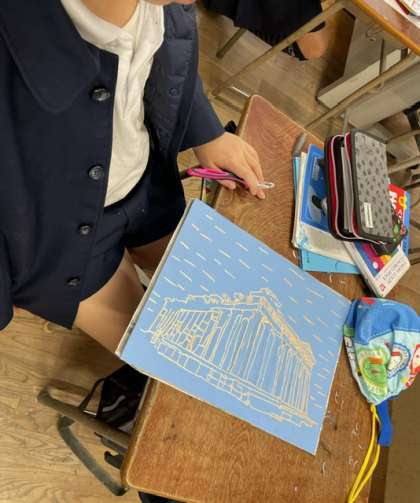 世界遺産に登録されている建物を彫刻刀で掘っています。