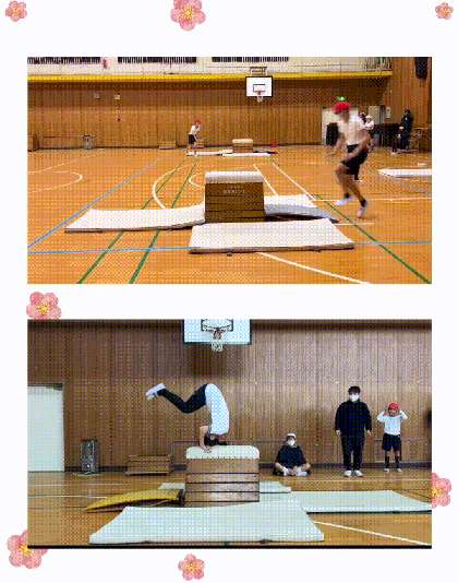 体育では、台上前転や首はね跳びにチャレンジしました。