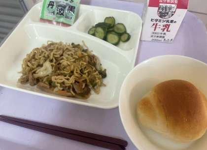 大阪市の焼きそばは、ちぢれ乾麺を茹でて具と混ぜ合わせて炒めて作っています(^^)麺に味がよく絡んで美味しいですよ。きゅうりのしょうがづけは、輪切りにしたきゅうりをしょうが風味の調味液につけて味をつけています。