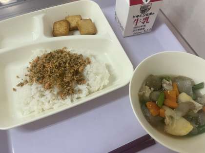 煮ものは、干し椎茸の風味がしっかりきいてごはんの進む味付けでした。また、紅ざけそぼろは、青のりや調味料で味付けをし、ごはんに添えて食べます。あつあげは、オーブンで焼いた一口厚揚げにしょうゆだれをかけており、人気のおかずです。