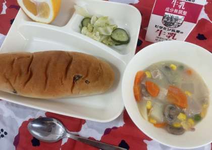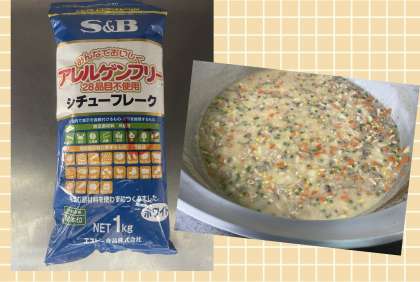 今日のシチューは、アレルギー特定原材料等28品目を使用しないシチューの素を使用しています。牛乳、乳製品、小麦粉などを使用しないため、乳アレルギーや小麦粉アレルギーの児童も食べられる献立になっています。