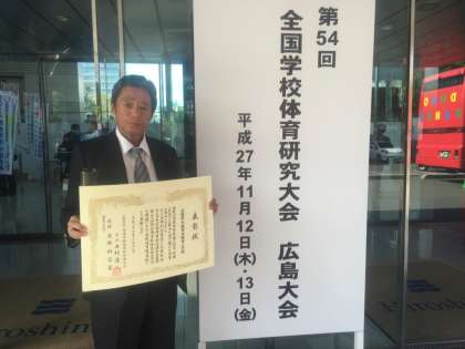 11月12日に本校が「平成27年度 全国学校体育研究優良校」として文部科学省より表彰をうけました。また、松本行弘校長が「平成27年度 全国学校体育研究功労者」として同じく文部科学省より表彰をうけました。表彰式は「第54回 全国学校体育研究大会 広島大会」の場でおこなわれました。めでたいダブル受賞となりました。