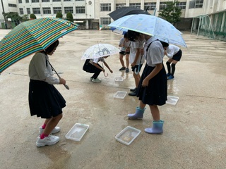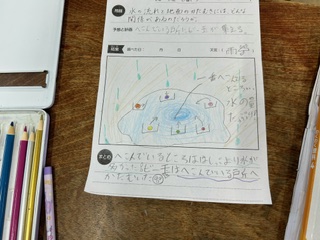 水の流れと地面の傾きの関係について、ビー玉を使って調べました。全て同じ方向にビー玉が転がり、地面が低いところに水が流れていることが分かりました。