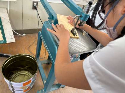 電動糸のこぎりを使ってテープカッター作りをしています。完成が楽しみですね!!