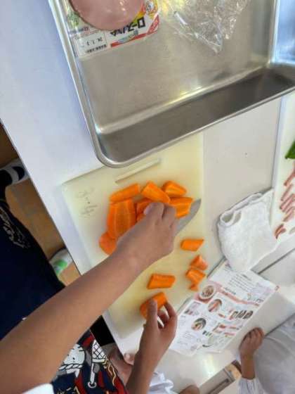 家庭科の時間に調理実習を行いました。メニューは『いろどり野菜炒め』です。はじめて『炒める』という調理をしました。美味しいなるには火加減や炒める順番など様々な点に注意しないといけませんでしたね。1組は明日行います。お家でも作ってみよう!