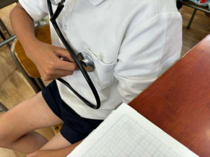 聴診器を使って拍動を調べています。結果は個人差がありましたね。