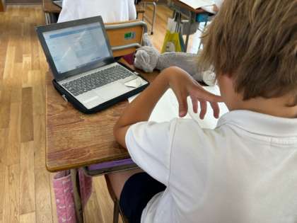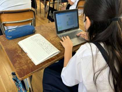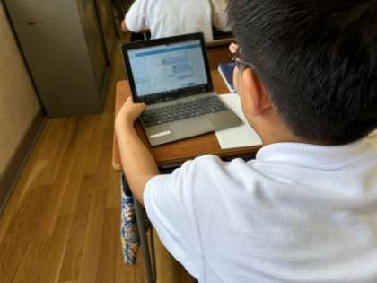 偉人たちの言葉を調べ、共感した部分などを文章にまとめました。その文章を読み、みんなで交流しています。交流にはタブレットを使いました。