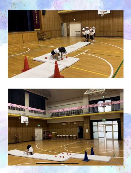 様々なコーナーで転がったり、逆さまになったりしながら運動遊びを楽しんでいます。