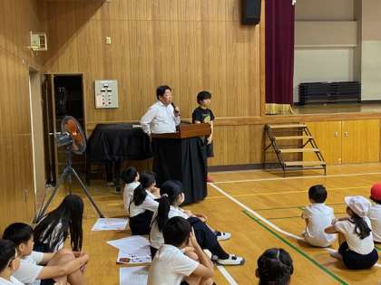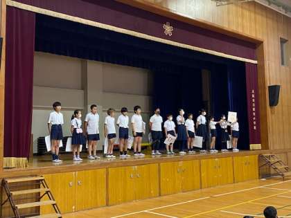 明日は桜小カーニバルがあります。今日の集会は桜小カーニバルで出す各お店の紹介をファミリー長さんが行いました。どのお店も面白そうな出し物ばかりでしたね。明日が楽しみです。