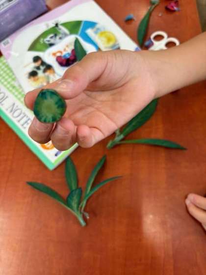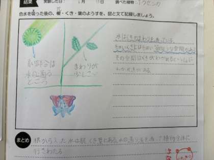 植物の体の中の水の通り道を調べました。染色液を使うことで水の通り道がわかりやすくなりましたね。わかったことをお家の人に伝えてみよう!