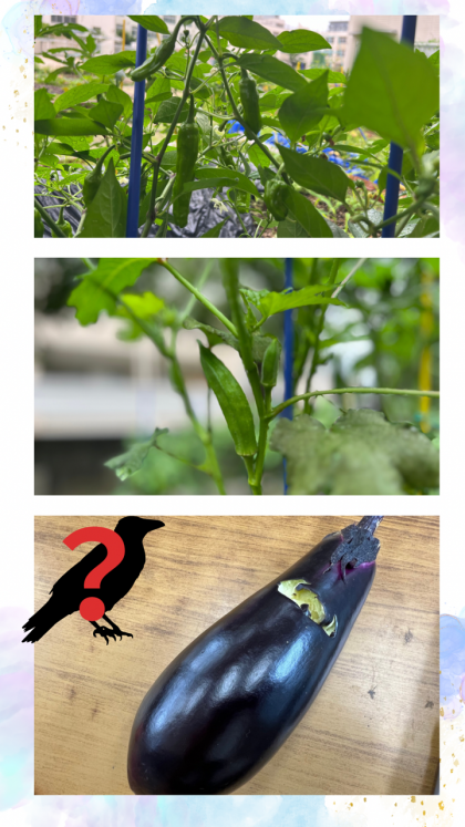 育てている野菜がどんどん大きくなってきました。休み時間も観察をして、大切育てていたのですが…ナスにつつかれた跡が!