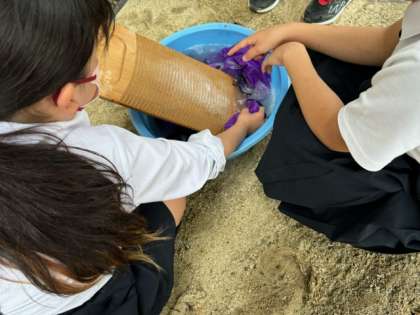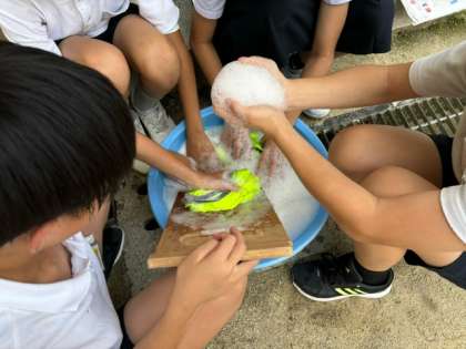 家庭科の時間に手洗いの実習を行いました。ゼッケンと靴下を洗いました。お家でもやってみよう!!!