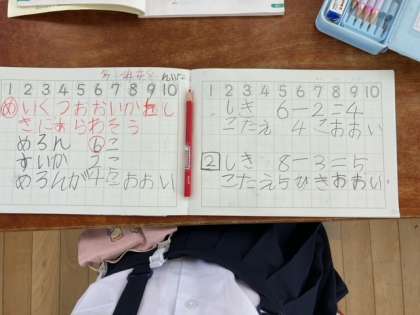 授業ではひき算を使う学習に取り組んでいます。数の大小をきちんと確かめて、ひき算の式を作ることができました。ノートもとても丁寧に書けていますね!