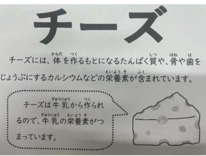 チーズには、体をつくるもとになるたんぱく質や骨や歯をじょうぶにするカルシウムなどの栄養素が含まれます。