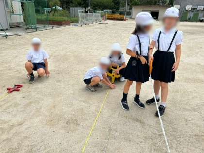 算数の授業で50メートルを測り、何秒でいけるかを調べました。その後その記録を基に、500メートルでは何秒になるかを計算して出しました。計算のスピードもぐんぐん上がっています。