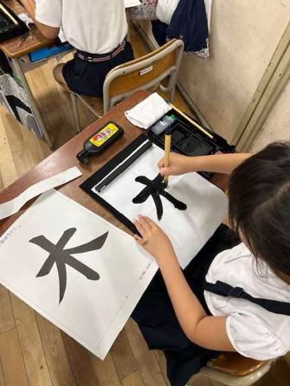 みんな姿勢良く集中しています。左側のはらいと右側のはらいを意識して綺麗に書くことができました。