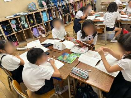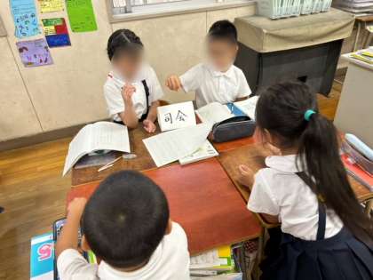 国語の授業で司会を決めて、その司会を中心にグループの合言葉を考えました。