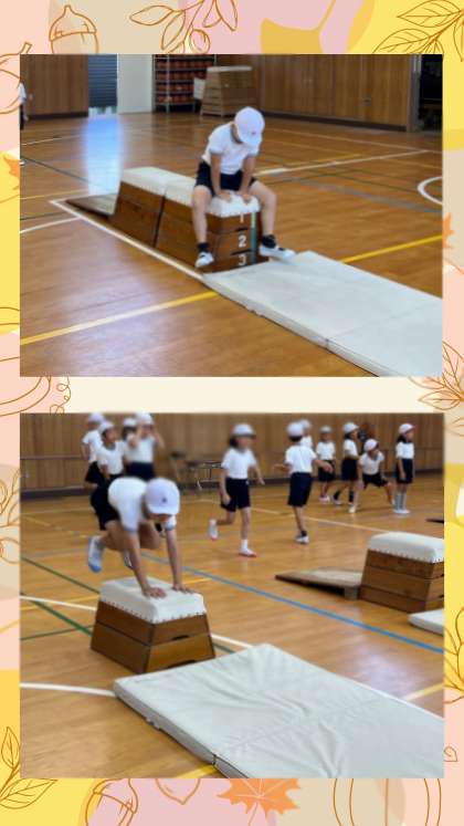 手の着き方や着地の仕方に気をつけて、支持でのまたぎのりや跳びのりをしました。踏み切りも上手にできていて、腰が高く上がっていました。
