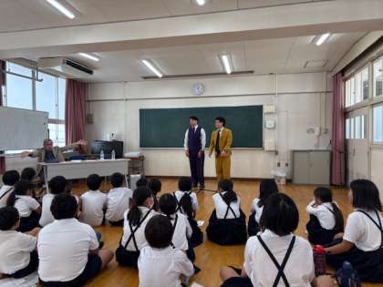 3、4時間目には1組、5、6時間目には2組で吉本出前授業を行いました。今回は『ボロボロバイセコー』のお2人、これまでたくさんの芸人さんを育ててこられた大工富明さんに来ていただき、人を笑顔にさせる、楽しませる"お笑い"について学ばせていただきました。