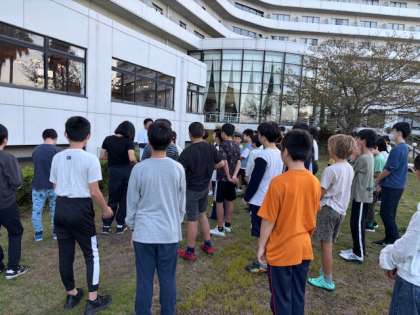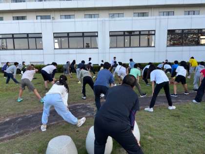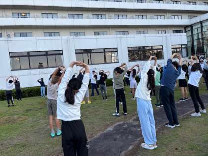 おはようございます。朝の集いの様子です。昨日はぐっすり眠れた子が多かったようですが、まだ少し眠そうです。今日一日元気に過ごすために体操をしています。楽しみながら成長できる一日にしましょう。