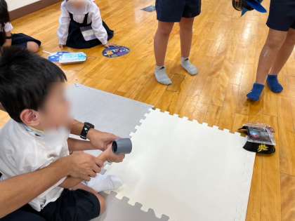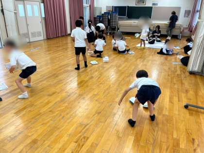 5時間目には、広い部屋で実際に風を当て、動いた作品に喜びの声をあげていました。
