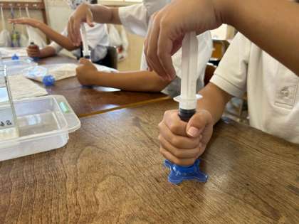 理科の「とじこめた空気や水」の学習では、水も空気と同じようにおしちぢめることができるのかを実験しました。ピストンをおしたときの注射器の中の水は、おしちぢめることができず、体積が変わらないということが分かりました。