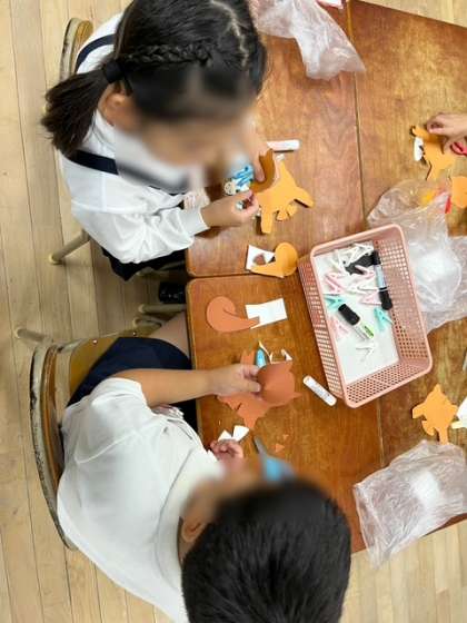 今日の図工科では「はさみ名人」「のり名人」を目標に、あきのすてきなかざりを作りました。
