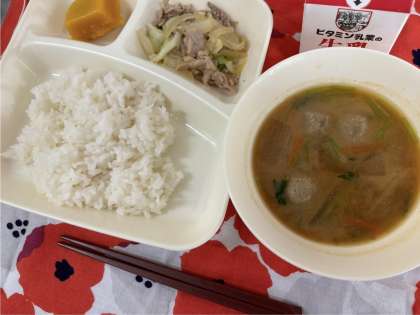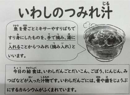 きょう今日の給食は、いわしだんごとだいこん、ごぼう、にんじん、みつばなどが入った汁物です。いわしだんごには、骨や歯をじょうぶにするカルシウムがふくまれています。