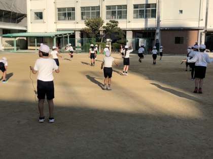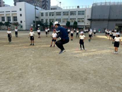 運動能力向上授業では、なわとびをしました。山村先生に教えていただいたコツを使って、あやとびや二重跳びなどを上手に跳べるようになりました。