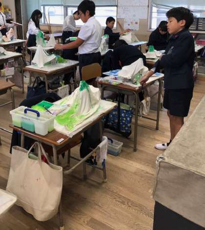 図画工作科「ぼく・わたしの無人島日記」では、液体粘土をつけてカチカチに固まった布に色をつけました。