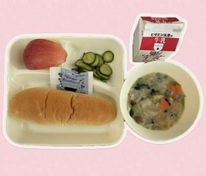 今日の「鶏肉ときのこのクリームシチュー」には、しめじ、エリンギ、マッシュルームを使っています。きのこがたっぷり入っていて旨味が出ていましたね。今日のりんごは、長野県産サンふじが出ました。ジューシーでおいしかったですね。