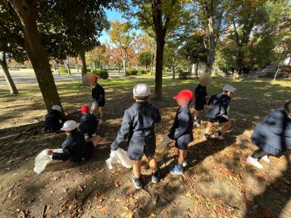 子どもたちは落ち葉やどんぐりを見つけて、楽しそうな声をあげていました。