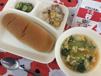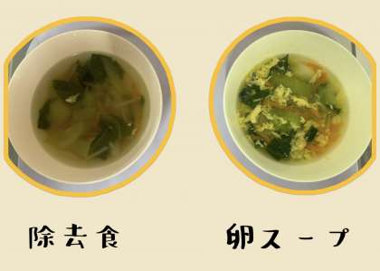 今日は卵アレルギーの児童に除去食(卵を入れていないスープ)を提供しています。