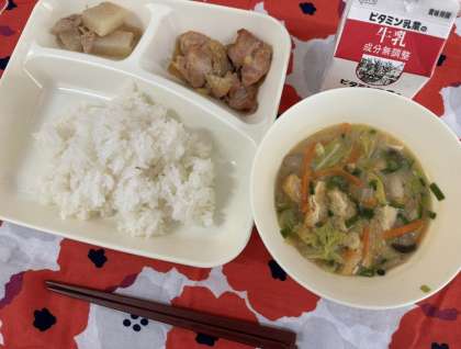 だいこんの煮ものは、片栗粉でとろみをつけており体が温まるおかずです。みそ汁には冬が旬の白菜が入っていました。