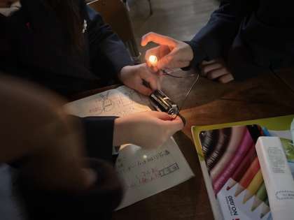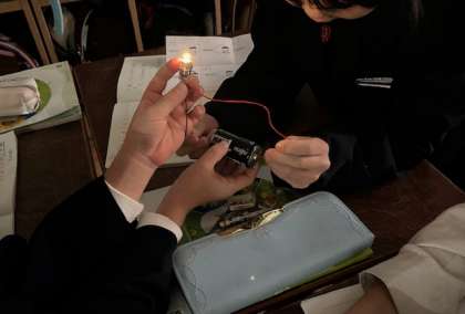 理科の学習で、電池を使って豆電球に明かりをつけました。いろいろな導線の繋ぎ方を試してみて、明かりがつく時の回路に気づくことができました。
