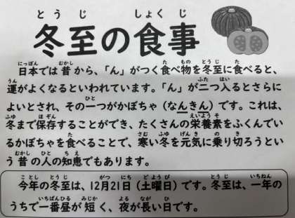 今日は冬至の日に食べると縁起が良いといわれている食べ物「かぼちゃ(なんきん)」が出ました。蒸したかぼちゃに、甘いみつをかけています。冬至の日には「ん」が2回つく食べ物を食べると縁起がいいとされています。また、ゆず湯に入るのも有名ですね。
