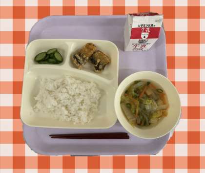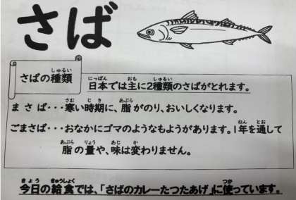 ごまさば・・・おなかにゴマのようなもようがあります。1年を通して脂の量や、味は変わりません。今日の給食では、「さばのカレーたつたあげ」に使っています。