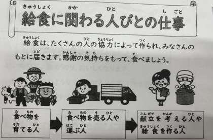 食べ物を育てる人、食べ物を売る人や運ぶ人、献立を考える人や給食を作る人など多く人が関わっています。