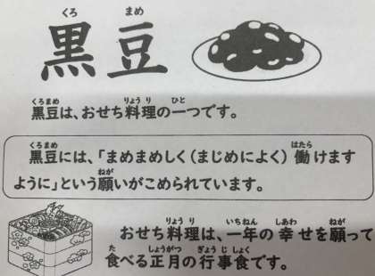 黒豆は、おせち料理の1つです。黒豆には、「まめまめしく(まじめによく)働けますように」という願いがこめられています。おせち料理は、一年の幸せを願って食べる正月の行事食です。