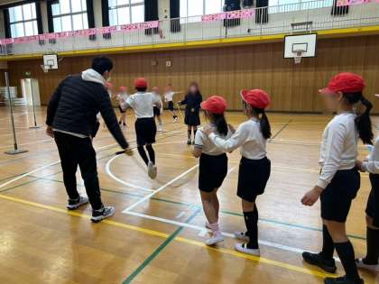 体育の授業でクラスみんなで大縄チャレンジを行いました。みんなで連続で続けて跳べるように、練習しています。